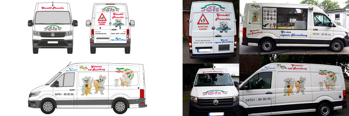 Das Eiscafe Pinocchio hat zwei neue Eiswagen im Fuhrpark und hatte den Wunsch, dass die handbemalten Motive vom bestehenden Fahrzeug auf die neuen Fahrzeuge aufgebracht werden. Hierfür wurden Fotos der Motive von uns gemacht und anschließend grafisch aufbereitet und für den Druck vorbereitet.