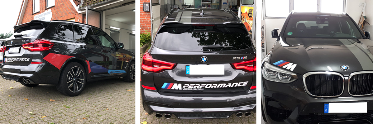 Unser Team aus der Werbetechnik hatte diese Woche Specialauftrag. Ein Privatkunde, BMW-Liebhaber, hatte den Wunsch seinen BWM X3 M Performance optisch zu verschönern. Grundlage waren dafür die Trikolore des M Logos: Hellblau, Dunkelblau und Rot. Um das portliche Motto zu komplementieren, wurden auf der Motorhaube und dem Autodach zwei anthrazit-farbene Streifen appliziert.