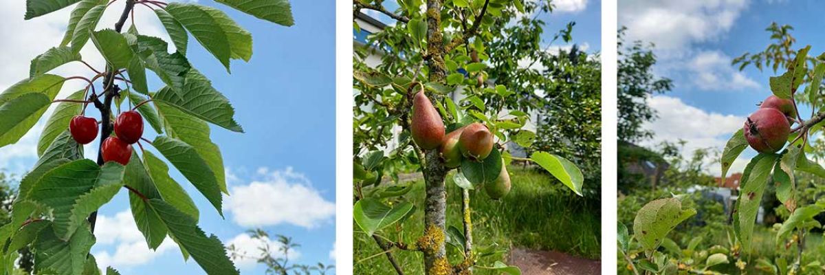 Erste Früchte - Blühwiese-Update Und auf einmal tragen unsere heimattypischen Bäume erste Früchte.Der Kirchbaum hält die ersten paar Hände Ernte bereit und die Birnen und Äpfel werden von Tag zu Tag größer. Zurück Weiter